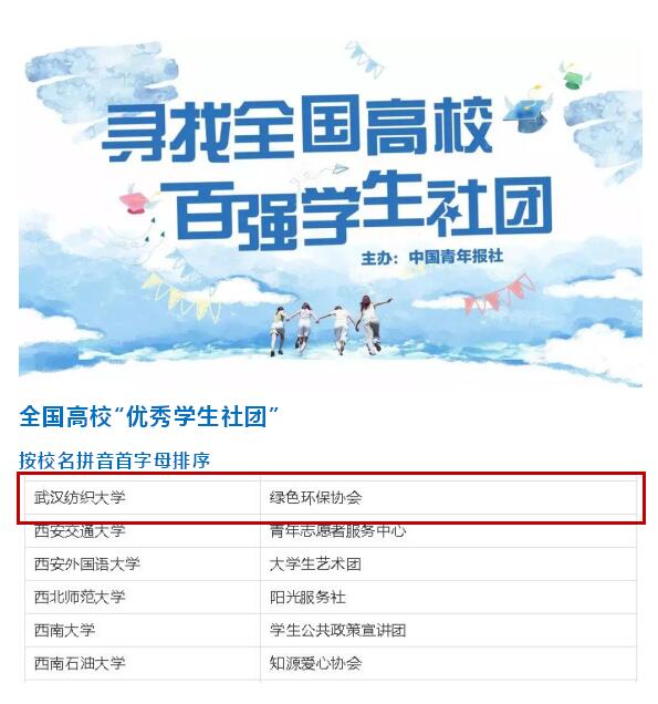 “寻找全国高校百强学生社团”活动旨在推动高校社团规范化发展、繁荣校园文化,充分发挥社团在实践育人、文化育人、服务育人等方面的积极作用,并进一步促进大学生综合素质的提升。此次共评出全国高校“最佳学生社团”10个、“优秀学生社团”30个、“百强学生社团”60个,我校绿色环保协会首次获评全国高校“优秀学生社团”。