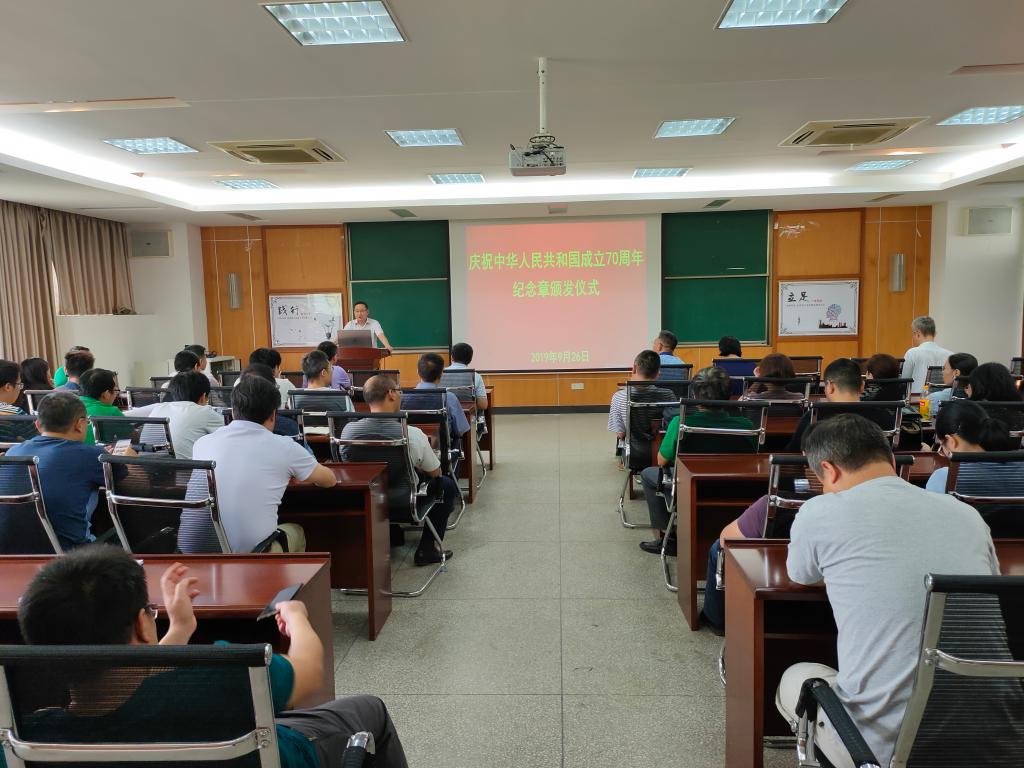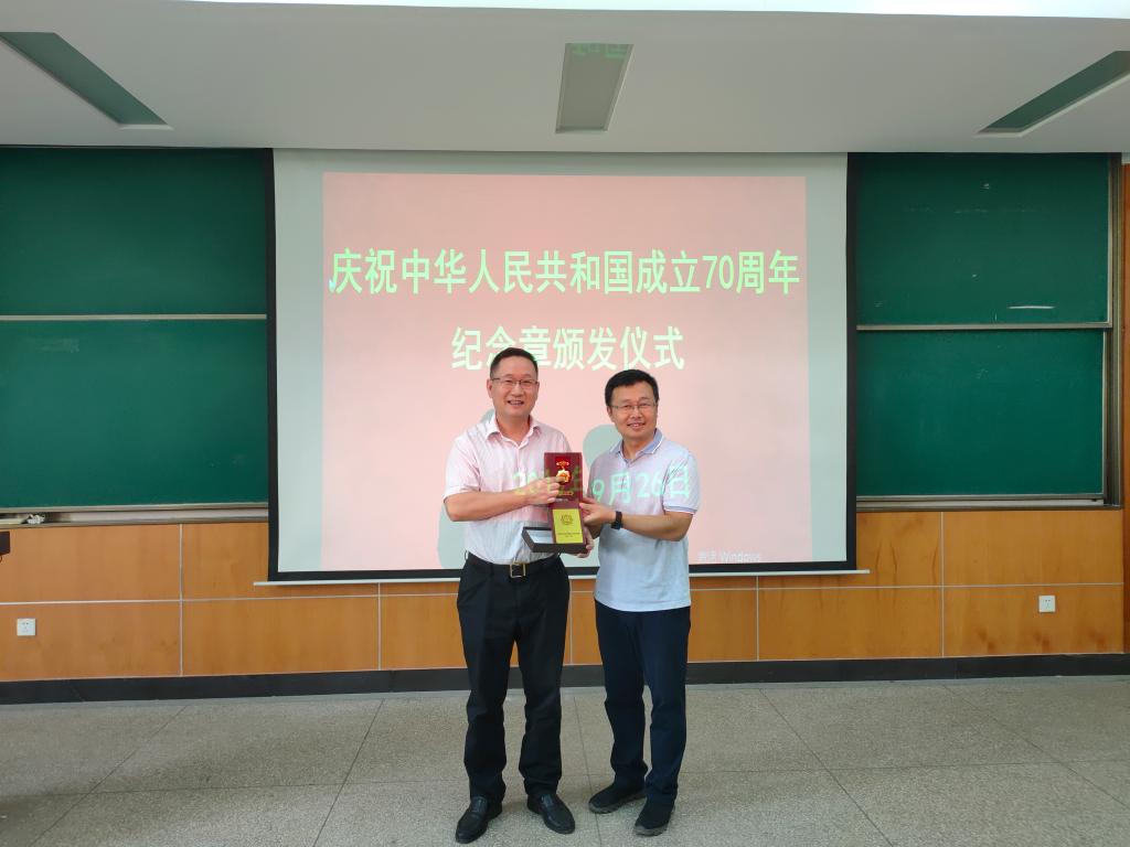 在新中国成立70周年前夕,党中央、国务院和中央军委决定颁发“庆祝中华人民共和国成立70周年”纪念章,环境色播app夏东升教授获此殊荣。9月26日下午,校长彭育园教授亲自到崇礼楼三楼会议室为其颁发纪念章。