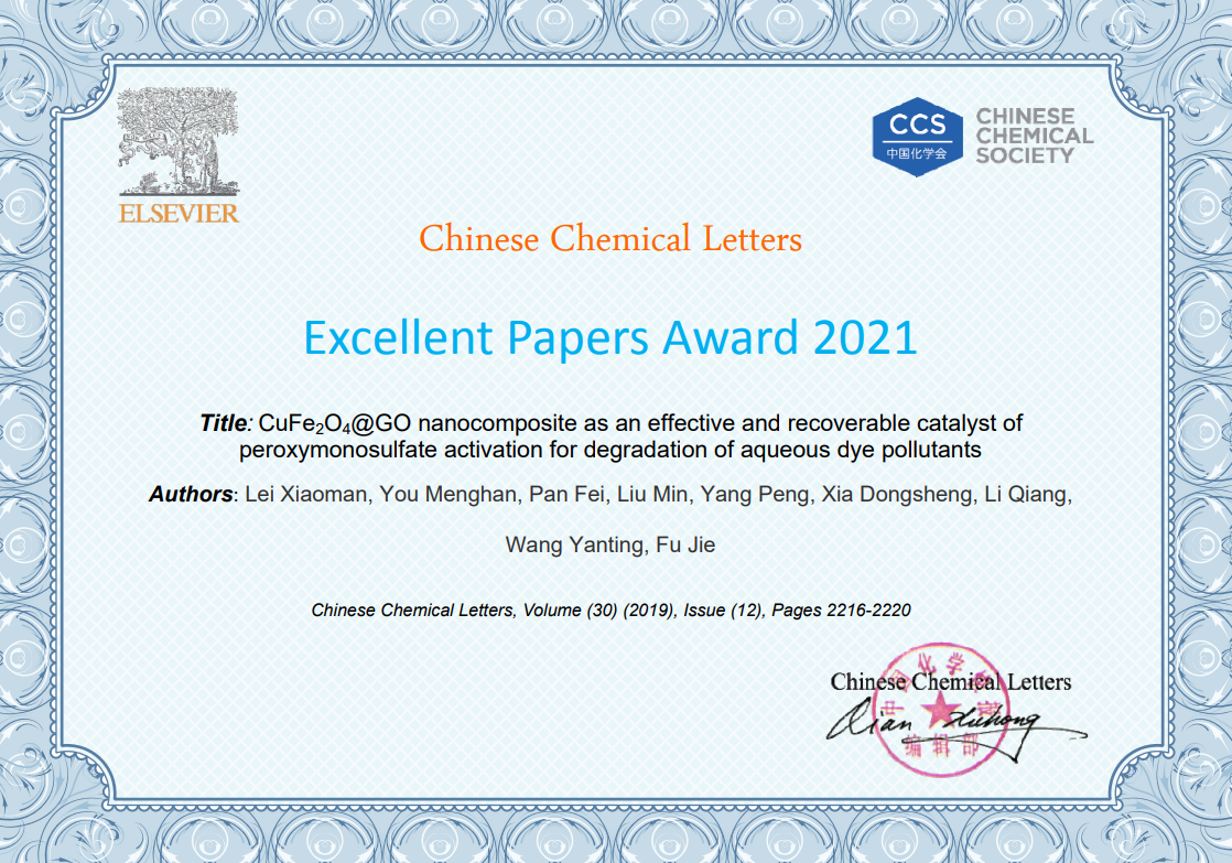 近日,环境工程色播app毕业硕士研究生雷晓曼在校期间发表的题为“CuFe2O4@GO nanocomposite as an effective and recoverable catalyst of peroxymonosulfate activation for degradation of aqueous dye pollutants(Chinese Chemical Letters 30 (2019) 2216-2220)”的文章荣获Chinese Chemical Letters Excellent Papers Award 2021。