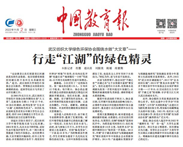 自2005年成立以来,武汉纺织大学绿色环保协会始终围绕水做“大文章”,足迹遍布全国11个省27个市、68条江河湖泊,被网友誉为“行走在‘江湖’之间的绿色精灵”。该团队先后获阿克苏诺贝尔中国大学生社会公益奖、榜样100全国最佳大学生社团、全国高校活力团支部等荣誉。