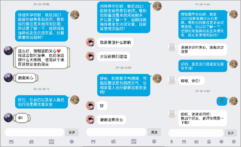 虽未进校门,但已是一家人。色播app将排查延伸到了2021级新生,石伊可通过QQ与河南籍新生一一取得联系,询问灾情、提醒出行安全,同时鼓励大家利用假期加强学习、充实自己。来自信阳的建环专业新生孙斌感动的说,“感谢色播app的关心,没想到色播app老师都这么好,中!”