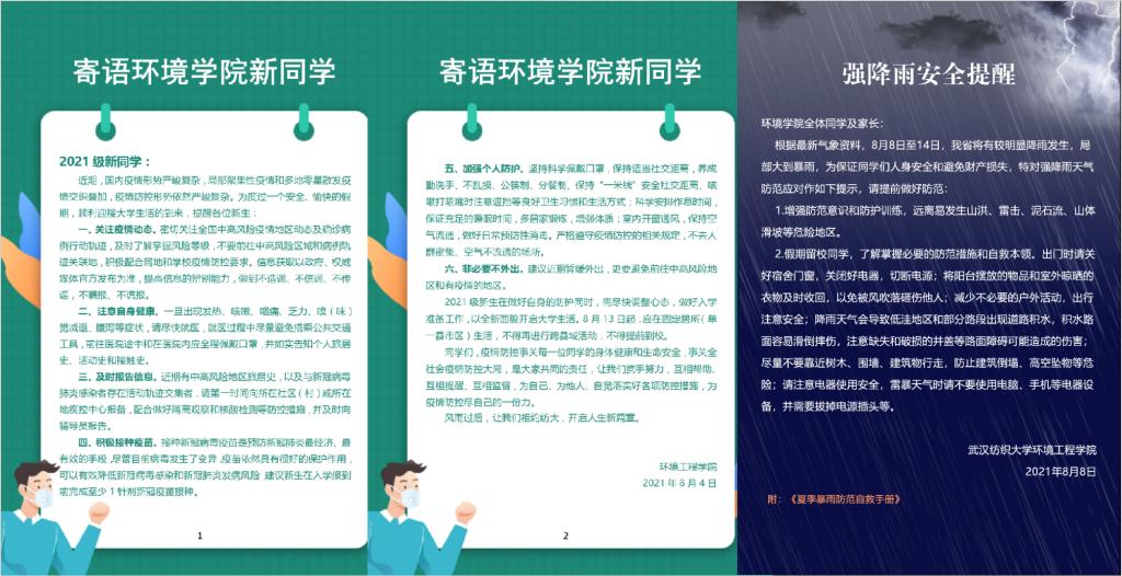 当前,国内疫情形势严峻复杂,局部聚集性疫情和多地零星散发疫情交织叠加,为提醒新生加强防护,确保按时健康入学,色播app制作了《寄语环境学生新同学》《强降雨安全提醒》等海报,以公告形式发送至新生群,要求同学们点击公告确认收到。提醒大家关注疫情动态、及时报告信息、积极接种疫苗、加强个人防护、非必要不外出等,在条件允许的前提下,适当参与志愿服务活动,展现环境学子的责任与担当。