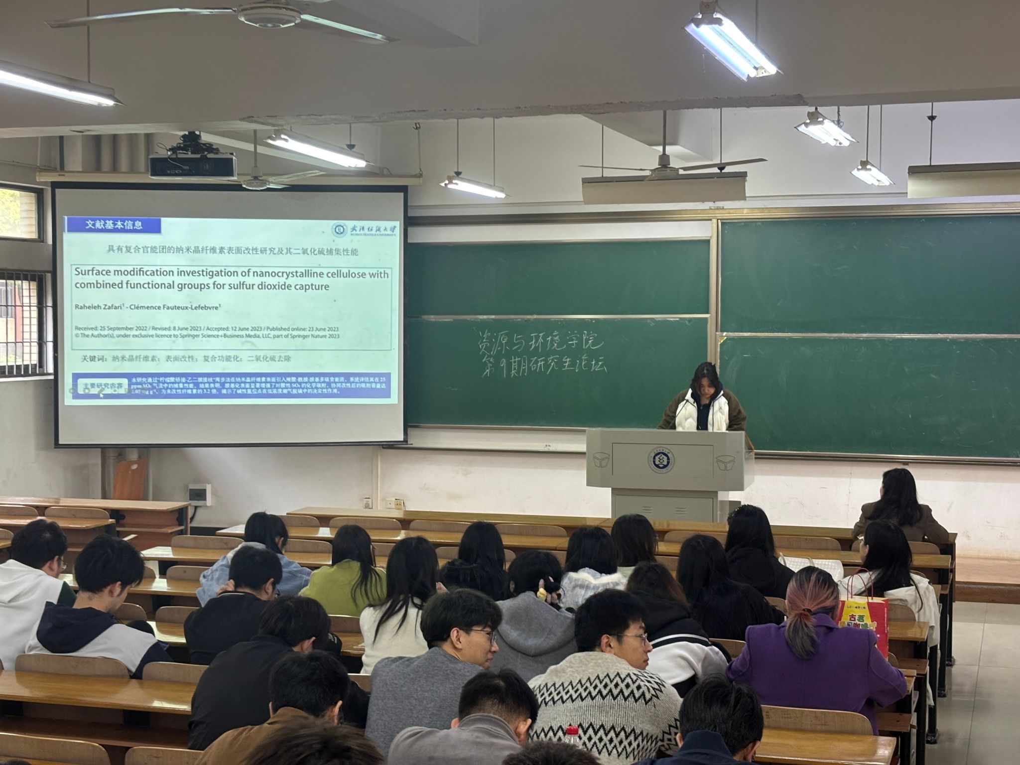 郑心雅同学探讨了通过“柠檬酸桥接-乙二胺接枝”两步法在纳米晶纤维素表面引入羧酸-酰胺-胺基多级官能团,系统评估其在25 ppm SO2气流中的捕集性能。结果表明,胺基化表面显著增强了对酸性 SO2的化学吸附,协同改性后的吸附容量达1.05 mg/g,为未改性纤维素的 3.2 倍,揭示了碱性氮位点在低浓度烟气脱硫中的决定性作用。