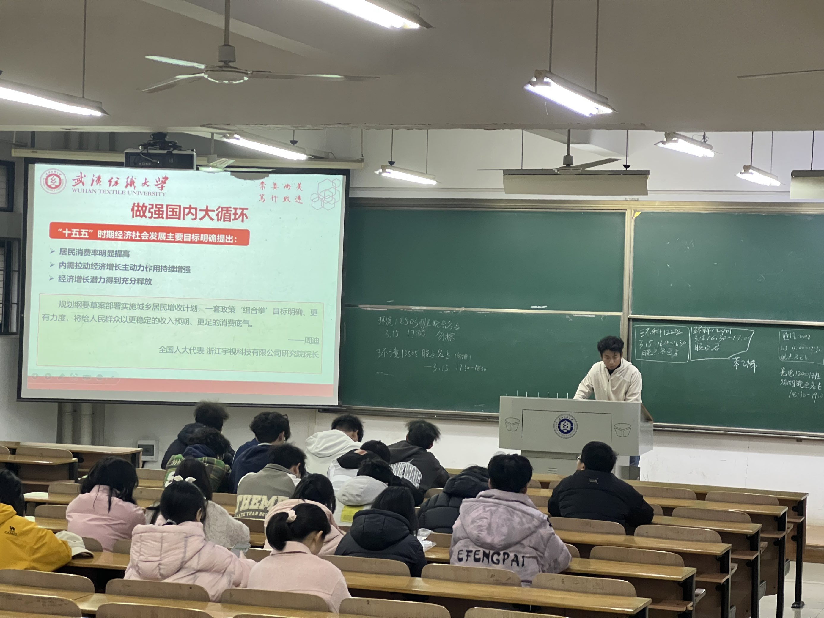 结合学校特色,班会特别设置“两会上的纺大声音”环节。全国人大代表、中国工程院院士、校党委书记徐卫林关于传统产业转型升级的履职建言引发热烈讨论。“嫦娥六号”月面国旗的玄武岩纤维技术,纺织产业从穿衣保暖向航天军工、生物医用领域的跨越,生动诠释了“没有落后的产业,只有落后的技术”。湖北传统产业“三线并进”“三箭齐发”的焕新蝶变,极大增强了同学们对专业学习和未来发展的信心。